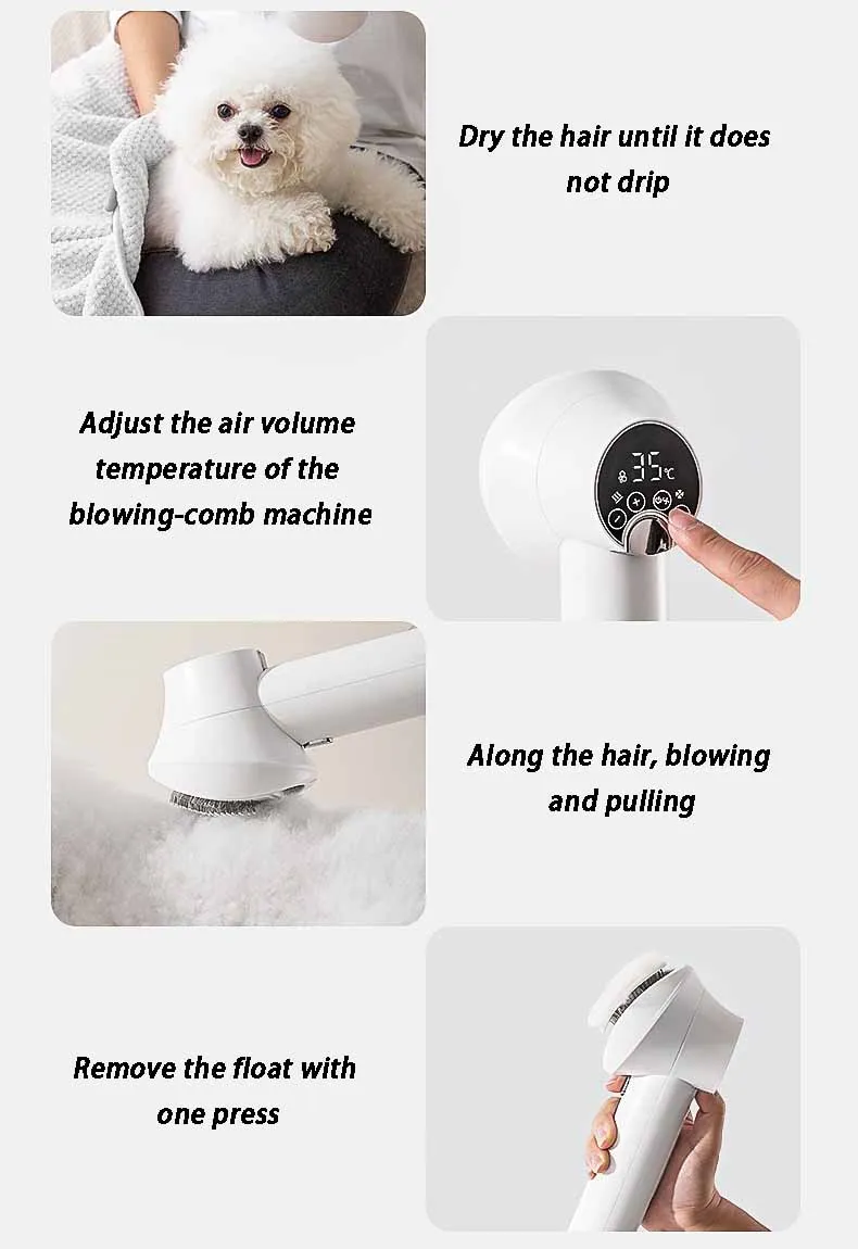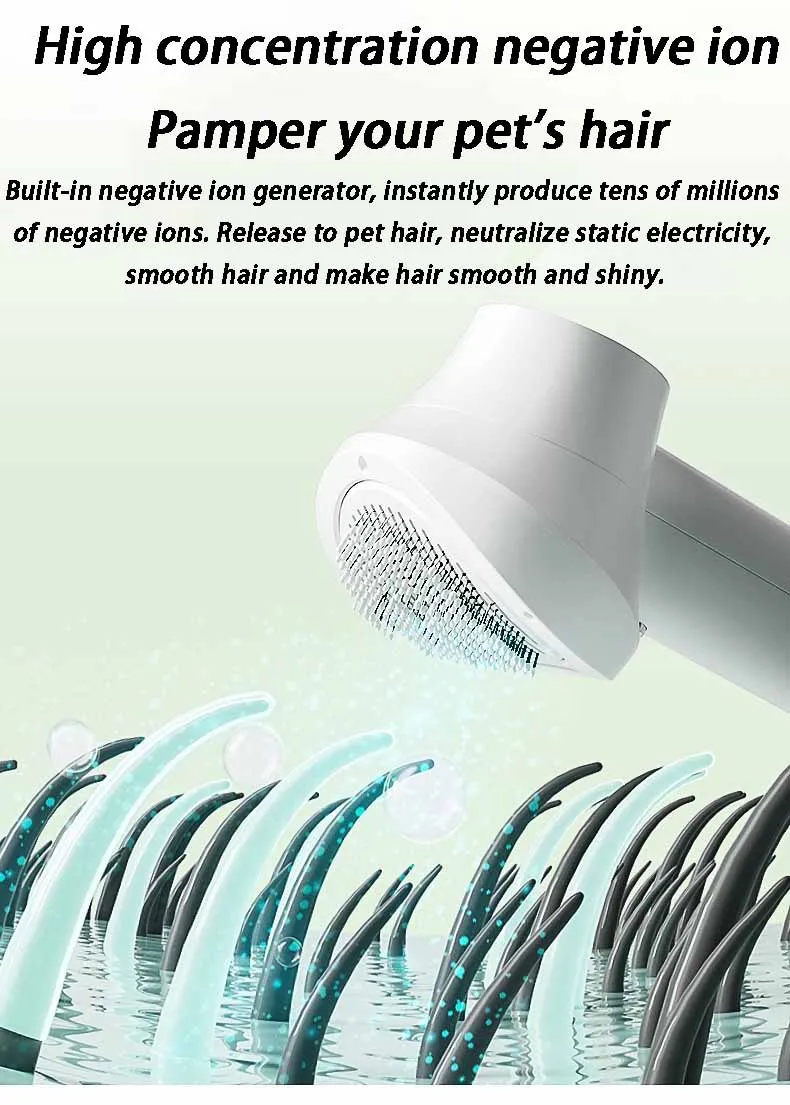 Diseñado especialmente para uso doméstico o profesional, combina secador y cepillo en un solo dispositivo. Su potente motor permite un secado rápido y silencioso, reduciendo el estrés de las mascotas.